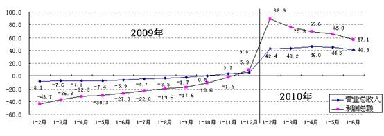 图1:2009年至2010年6月营业总收入、实现利润增幅变化情况(单位:%) (二)实现利润。1-6月,国有企业累计实现利润9275.9亿元,同比增长57.1 %,6月比5月环比增长7.7%。(1)中央企业累计实现利润6410.6亿元,同比增长46.4%,6月比5月环比增长4.4%。其中,中央管理企业累计实现利润5247.7亿元,同比增长65.2 %,6月比5月环比增长9.2%。(2)地方国有企业累计实现利润2865.3亿元,同比增长87.9%,6月比5月环比增长14.5%。 (三)应交税费和已交税费。1-6月,国有企业应交税费12147.4亿元,同比增长33.5%,6月比5月环比增长5.6%。(1)中央企业累计应交税费9291.4亿元,同比增长34.7%,6月比5月环比增长6.2%。其中,中央管理企业累计应交税费6569.2亿元,同比增长36.7%,6月比5月环比增长7.2%。(2)地方国有企业累计应交税费2856亿元,同比增长29.7%,6月比5月环比增长3.8%。 1-6月,国有企业已交税费12142.1亿元,同比增长25.9%,6月比5月环比下降11.5%。(1)中央企业累计已交税费9129.8亿元,同比增长25.8%,6月比5月环比下降11.7%。其中,中央管理企业累计已交税费6492.6亿元,同比增长23.6%,6月比5月环比下降12.7%。(2)地方国有企业累计已交税费3012.3亿元,同比增长26.1%,6月比5月环比下降11%。 |