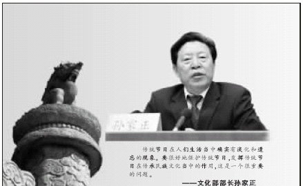 首批国家非物质文化遗产名录即将公布,春节等传统节日名列其中 ![]() ![]() ![]() 昨天在国务院新闻办公室举行的新闻发布会上,文化部部长孙家正说,报国务院批准,第一批国家非物质文化遗产名录即将公布,其中包括春节等在内的传统节日也列入了国家非物质文化遗产名录。 重要传统节日列入保护名录 孙家正承认,目前在中国人生活当中确实有淡化和遗忘传统节日的现象。他分析说,这是因为中国的传统节日多与中国农历纪年联系在一起,改成公元纪年以后,国人一般都只记得公历,而很少记得农历。 他认为,春节在所有的传统节日中是保护发展得比较好的一个节日。现在很多国家在中国春节的时候都会有领导人发表讲话,并举行盛大的纪念活动。因此,春节已成为对外推介中国文化的一个著名品牌。 孙家正指出,目前少数民族一些传统节日保存得比较好。为了加强传统节日的保护,中宣部发布了《关于运用传统节日弘扬民族文化的意见》,要求突出传统节日的文化内涵,精心组织好重要节庆活动,特别要组织好春节、清明节、端午节、中秋节等最具广泛性和代表性的节庆活动。 在这次非物质文化遗产保护当中,所有比较重要的传统节日都列入保护名单了。 非物质文化遗产纳入立法保护 新闻发布会上,文化部副部长周和平透露,文化部正在会同有关部门制定有关非物质文化遗产名录的管理办法,包括制定保护规划、建立保护档案,用文字、图像、多媒体等多种手段来建立档案。同时要鼓励各地建设民俗博物馆、非物质文化遗产方面的博物馆和资料文献的收集中心。 周和平还说,对于非物质文化遗产的传承人,各级政府也要制定保护办法,使身怀绝技的民间艺人、工艺美术大师很好地传承他的技艺。 另外,有些学校还要开设相关专业,来传承这些文化形式。 同时,各级财政还要逐步地加大投入,建立奖惩机制。 周和平说,中国是文化遗存非常丰富的国家之一,但过去只有文物保护单位,非物质文化遗产还没有用“名录”的形式来进行保护。 不过最近几年,各级政府对于非物质文化遗产的保护越来越重视,社会各界也非常关心。《非物质文化遗产保护法》已列入全国人大2007年立法计划,由全国人大、中宣部、文化部等多部门组成的立法工作领导小组正在对法律草案进行进一步的修改和完善。 ■政府举措 1080处文物纳入第六批国家保护 “十一五”期间将开展第三次全国文物普查工作 文化部部长孙家正昨日在国新办新闻发布会上表示,划入第六批的国家级重点文物保护单位确定有1080处。这样我国共有全国重点文物保护单位2351处。 孙家正说,近年来我国文物保护经费大幅增长,中央财政用于文物保护的专项经费从1994年的1.29亿元增加到2005年的5.34亿元。“十五”期间,除了一些专项经费,中央财政共投入17.36亿元,比“九五”增加10.06亿元,增幅138%.地方各级也投入61.53亿元,全国共投入78.89亿元。 另外,国家文物局局长单霁翔说,1956年和1981年我国曾进行过两次大规模的全国文物普查,“十一五”期间我国将开展第三次全国文物普查,有关部门已展开基础性工作。 到目前为止我国共有全国重点文物保护单位2351处,省级文物保护单位近9396余处,市、县级文物保护单位58300余处。此外,还有103座历史文化名城。 ■高层声音 个人收购流失海外文物值得肯定 国家文物局局长单霁翔谈民间文物保护: 在国新办昨天举行的新闻发布会上,国家文物局局长单霁翔对目前国内企业、民间团体乃至于个人参与收购流失海外的中国文物的做法予以了肯定,这是中国文物最高主管部门首次做出类似表态。 单霁翔说,中国是世界上文化遗产最丰富的国家,由于历史的原因,也是世界上文物流失最为严重的国家之一。据不完全统计,在47个国家的200多个博物馆里有中国文物大约100多万件。国内出现的企业、民间团体乃至于个人参与收购流失海外的中国文物的潮流的动机和热情是值得肯定的,这样的爱国行为也是应该得到尊重的。 单霁翔表示,应当明确的是,海外流失文物有着很复杂的背景,应该严格地在我国法律和国际公约框架下进行,特别是对一些涉案文物的处理,更应按照国际公约和文物保护原则进行,以确保这些社会资金在海外文物回流中能够发挥更积极的作用。 ■专家观点 节日文化是民族存在标志 北京非物质文化保护专家组成员赵书谈传统节日保护 北京市非物质文化保护专家委员会副主任赵书昨日接受本报采访时强调,节日文化是一个民族存在的标志,中华民族的传统节日是中国人的精神家园。 赵书认为,传统节日也是民俗的一个重要内容,是民俗世相的一个载体,“这种载体是一种不怕重复、发自内心的公众行为,过传统节日成为中华民族的共同的认识”。赵书表示,传统节日能增强中华民族的民族认同,实现民族内部的心理的沟通,能增强中华民族的心理凝聚力。 赵书认为,孙家正部长承认“确实有淡化和遗忘传统节日的现象”是对专家意见的一种认可,传统节日的淡化不仅仅与公元纪年有关,也有历史的原因。赵书说,在他的记忆里,1963年端午庙会是最后一个北京端午节庙会,不过他感到欣慰的是,昨天有人还在高碑店举办了一个端午民俗文化节。 赵书说,其实端午节的内容相当丰富,古代以祭祀为主,其中也包括吃粽子,但现在很多节日只剩下吃了。 他认为生活节奏加快不